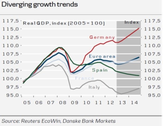 V reálné ekonomice eurozóny se dá letos v nejlepším případě asi čekat černá nula, poslední vývoj v Německu ukazuje, že úvahy o jeho odtržení mohou být skutečně opět nemístné (viz „Koruna začne posilovat, naše ekonomika růst a Německo se odtrhne“). Pohyb HDP hlavních ekonomik a projekce shrnuje následující graf od Danske Bank: