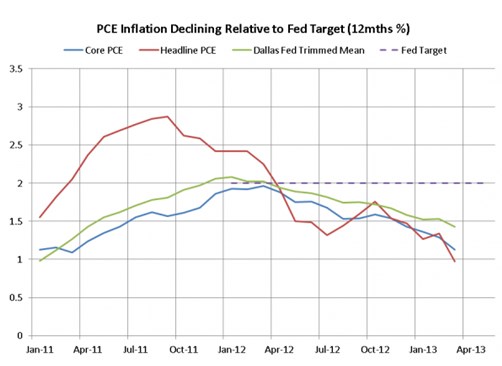 Ekonomové Fedu měli dlouho potíže s vysvětlením toho, proč inflace v prostředí velké produkční mezery zůstává relativně vysoko. Současný pokles je podle nich částečně vyvolán přechodnými faktory. Nikdo se nedomnívá, že pravděpodobnost deflace je vysoká. Hrdličky ale berou osmnáctiměsíční pokles PCE inflace vážně i přesto, že ještě nedošlo k posunu inflačních očekávání z 2 %. Jak řekl Dudley: „Deflační očekávání se mohou stát sebenaplňujícím se proroctvím.“ Je jasné, že se Fed při dalším postupu ohledně QE bude řídit daty. Ta ale budou vedle nezaměstnanosti zahrnovat i inflaci. Nyní je situace taková, že Fed nenaplňuje svůj mandát ani v jedné oblasti. To mu zkomplikuje a možná i oddálí rozhodování o tom, kdy ubrat plyn.