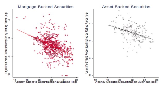 V žalobě není žádný statistický důkaz toho, že Standard & Poor’s manipulovala s ratingem. Na 6500 případech uděleného ratingu od Standard & Poor’s, Moody's a Fitch ale lze ukázat, že tento rating koreluje s tím, kolik zakázek daný klient ratingové agentuře poskytuje. Většinou se to projevuje u významných finančních institucí, které vydávají velký objem strukturovaných dluhopisů a agenturám tak zajišťují značnou část příjmů. Lepší rating jednotlivých tranší těchto dluhopisů se projevuje poklesem průměrného výnosu celé emise a tudíž i snížením nákladů, které se projeví v ziscích banky. V následujících dvou grafech je vyznačena korelace mezi tímto poklesem výnosů (osa y) a důležitostí klientů pro agentury (osa x). První graf se týká MBS, druhý ABS.