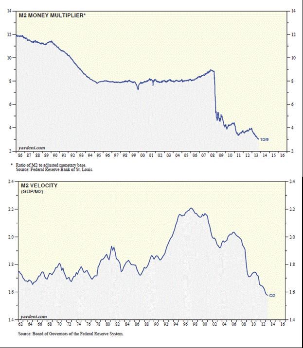 Uvedené je pokusem o popis principu, který by měl hlavně ukázat na to, jak zavádějící je dlouhá řada komentářů týkající se toho, co se vlastně děje s penězi. V dalším přemítání bychom se mohli vydat mnoha směry, jak jsem ale psal, původní záměr byl poukázat na prudký a hlavně neustále se prohlubující propad peněžního multiplikátoru a rychlosti obratu peněz v USA. To první můžeme chápat jako ochotu/schopnost systému tvořit z báze širší peníze, to druhé jako potřebu ekonomiky mít pro jednotku produktu určitý počet dolarů (tedy jako nutnost jejího „mazání“ oběživem).